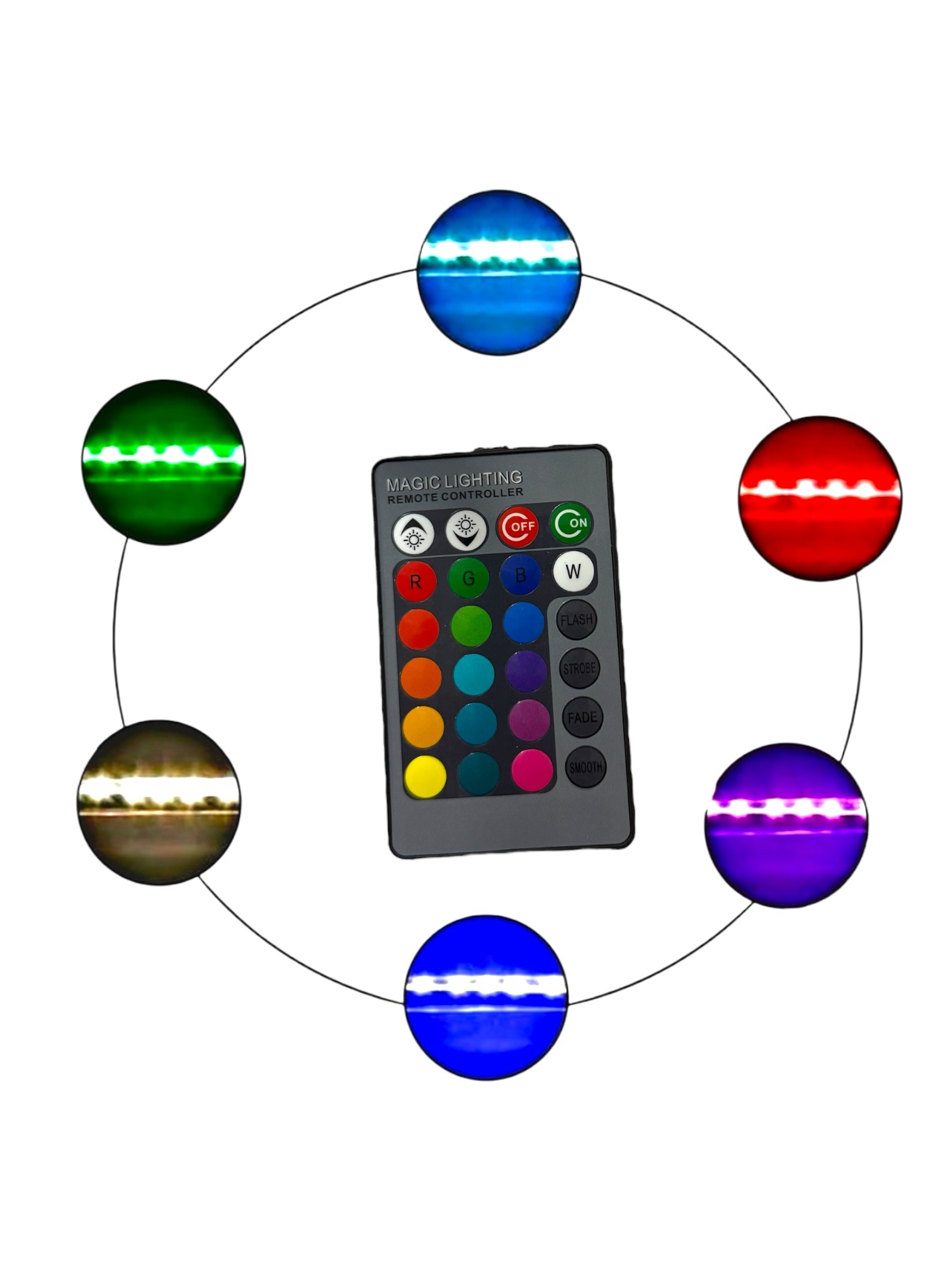 • control a distancia con varias funciones como: prendido y apagado subida y bajada de intensidad, colores a su elección, diseños de intensidad cambio de color automático etc.
