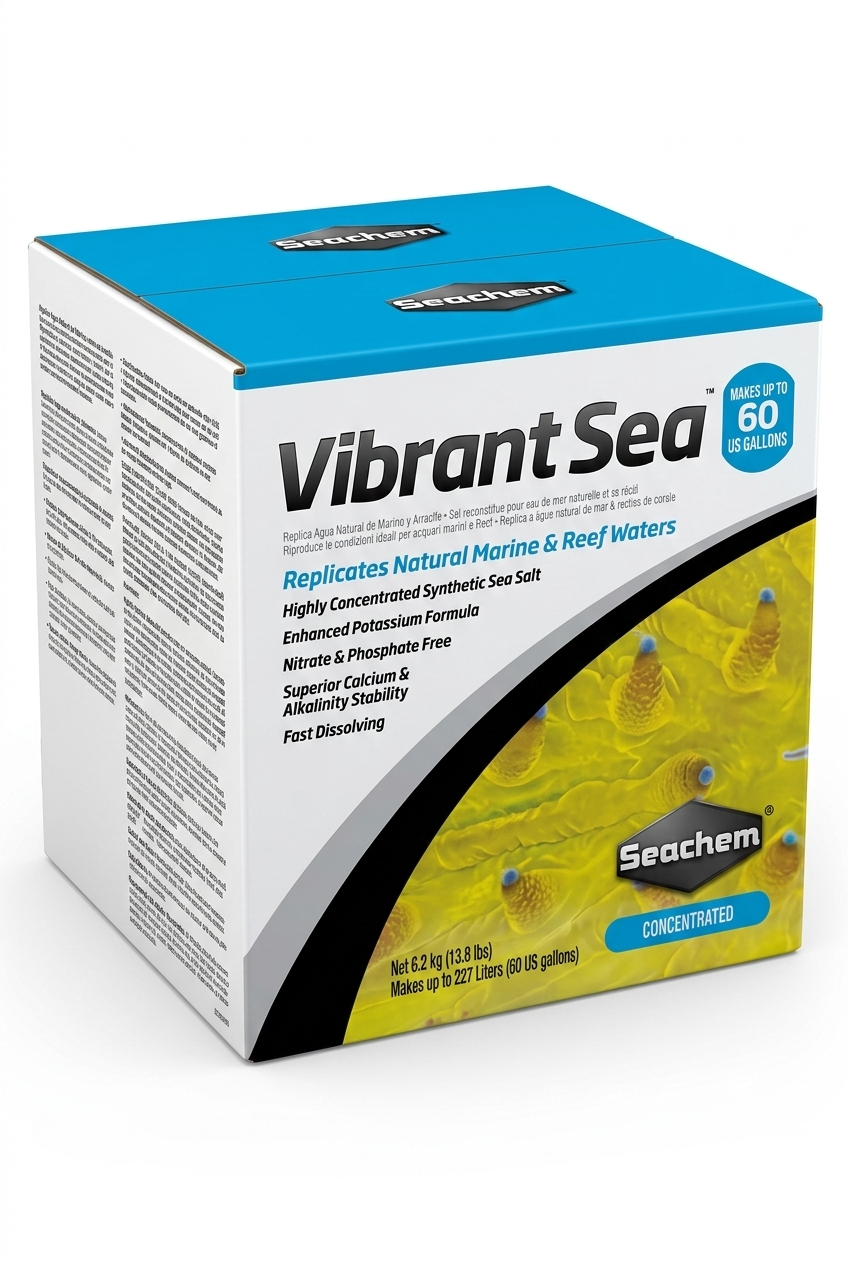 • Seachem Vibrant Sea es la sal sintética premium que replica las condiciones naturales del arrecife con alta concentración y disolución rápida. Libre de nitratos y fosfatos, garantiza niveles estables de calcio y alcalinidad para un acuario marino vibrante y saludable.