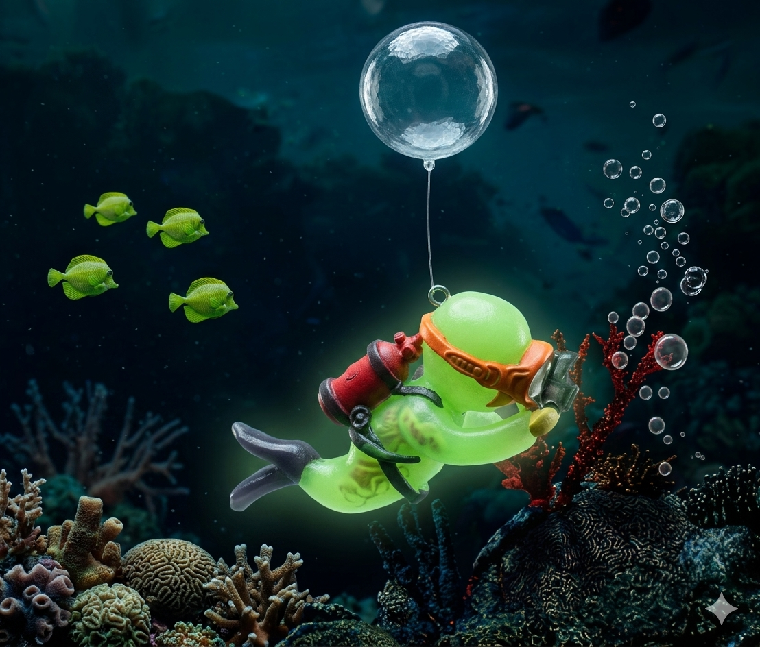 •Mini Buzo Flotante Neón • adorno sumergible hecho en resina con diseño de buzo color verde «Neón»