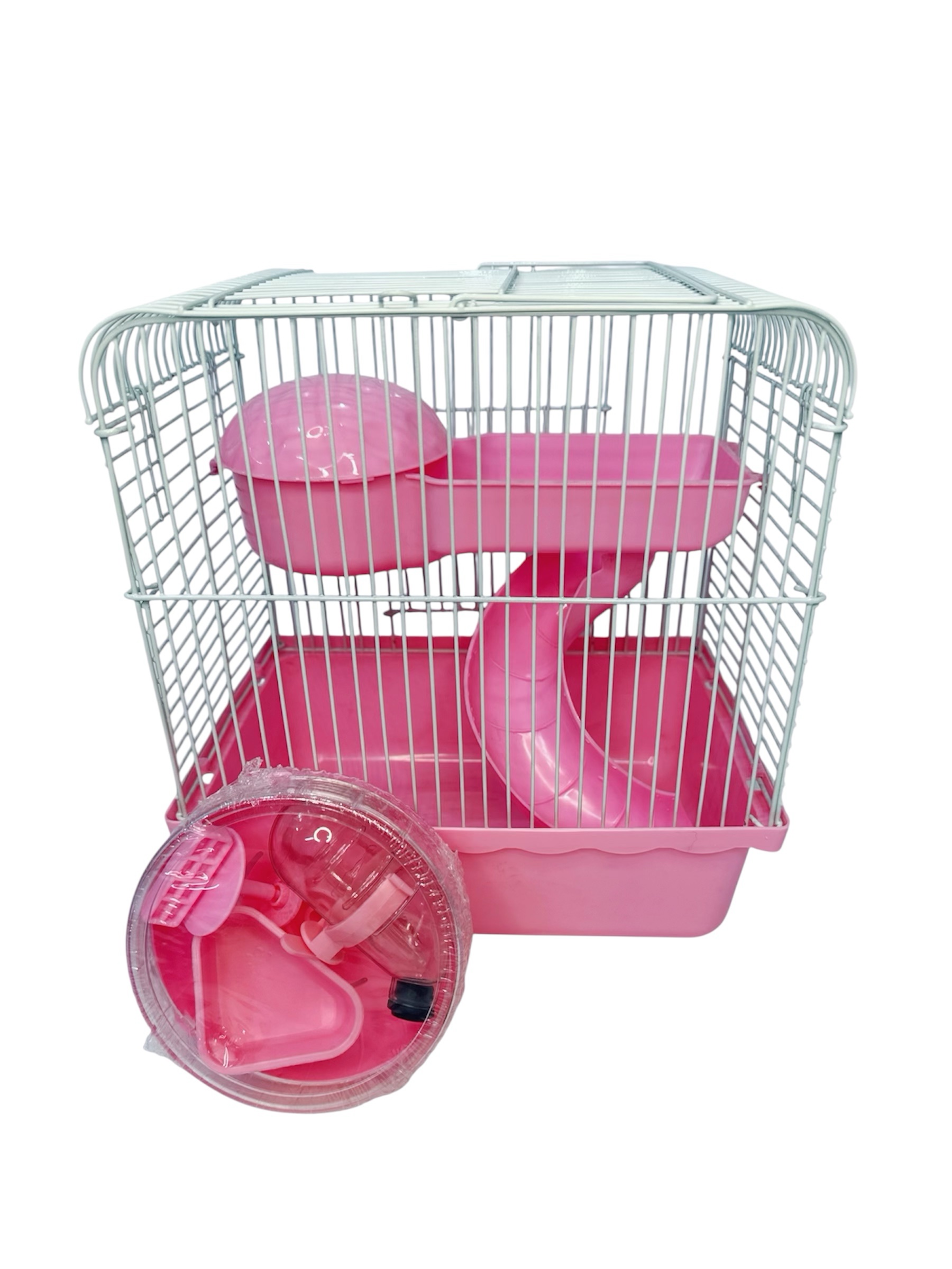 • incluye: rueda, 2 platós, jaula,bebedero y una casa con resbaladera